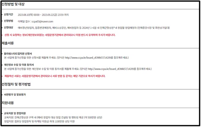 - 예비 청년 창업자, 업종 변경 예정자, 예비소상공인, 예비창업자 등 2024년 1~6월 내 진해 군항 상권 내 창업할 창업예정자(진해중앙시장 및 화천 상가 일대)