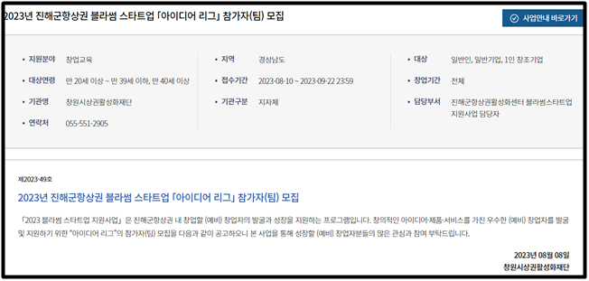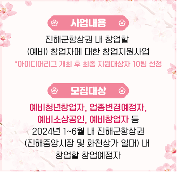 ▷ 문의처 : 진해 군항 상권 활성화센터 블라썸스타트업 지원사업 담당자(055-551-2905)
