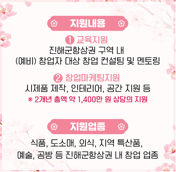 - 교육지원 : 진해 군항 상권 구역 내 (예비) 창업자 대상 창업 컨설팅 및 멘토링 제공(약 500만 원 상당)