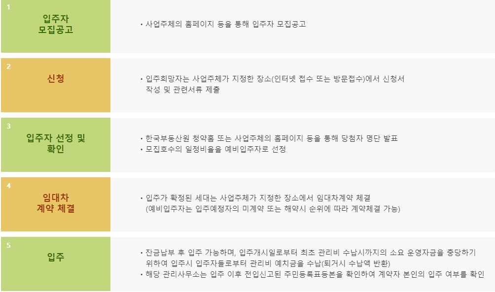 - 입주 자격 : 무주택자(미달 시 유주택자 가능), 주거 지원 계층 : 소득 요건 등 입주 자격 설정