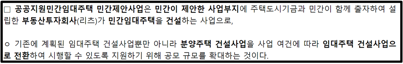 - 민간이 제안한 사업 부지에, 주택도시기금과 민간이 함께 출자해 설립한 부동산투자회사(리츠)가 민간임대주택을 건설하는 사업
