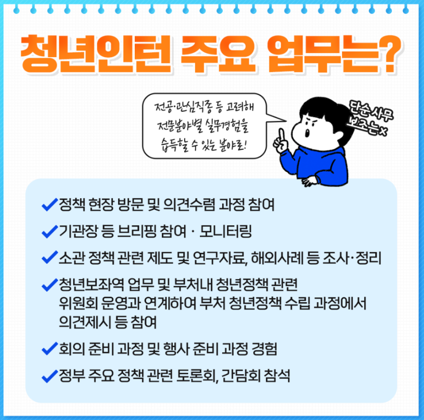 취업이 너무 어려운 현실에서 청년 인턴제도는 인턴 중 우수 청년에 대해서 다수의 인센티브가 제공되므로, 그만큼 취업의 문턱에 가깝게 다가간 것과 진배없으니 취준생 청년들에게는 정말 귀중한 기회가 될 것으로 여겨집니다.