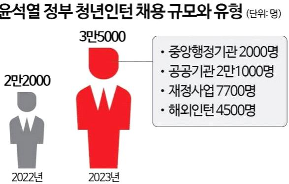 이를 통상 인턴 계약 기간인 3개월 기준으로 환산하게 되면, 올해 청년인턴 채용은 3만 2,000명 수준이니 엄청 인턴 일자리가 늘어날 것으로 보입니다.(참고로 2022년에는 6개월 이상 인턴이 989명에 그침)