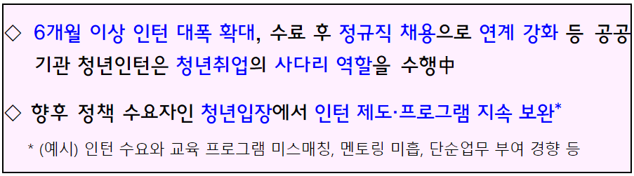 2) 청년층이 실질적인 업무역량 향상 및 취업 준비 적정기간을 6개월을 선호하는 점을 반영, 6개월 인턴을 1만 명 수준으로 확대