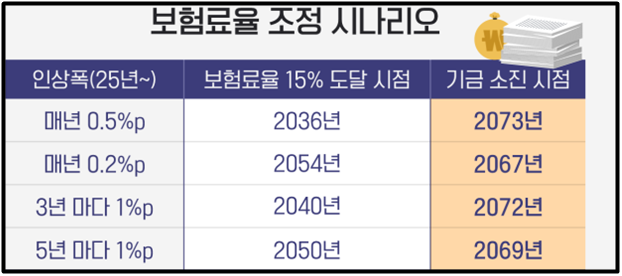 - 이렇게 되면 현재 2055년으로 예상되는 기금소진 시점은, 각각 2063년, 2071년, 2082년으로 늦춰짐