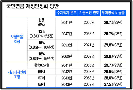 ▶ 보험료율 12%, 15%, 18% 인상, 연금 지급개시 연령 68세 상향