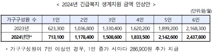 ▶ 생계급여 지원금액 인상(2024년 생계급여 지원금액이 '4인 기준' 13% 인상)