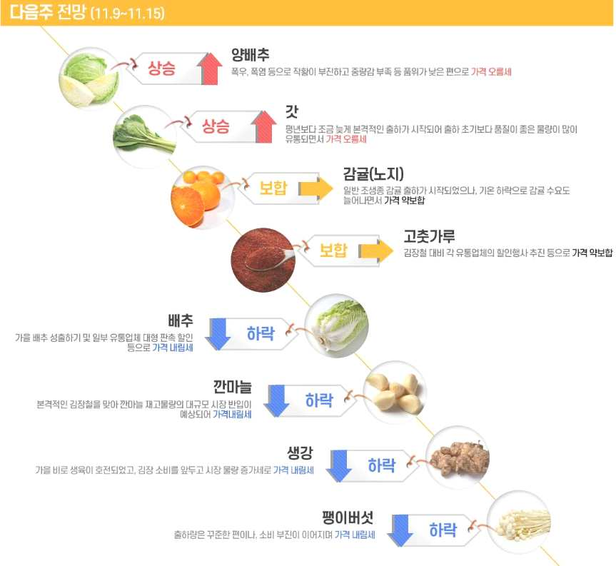 또 무, 마늘, 새우젓 등도 생산량이 증가해 공급에 문제가 없을 것으로 예상되며, 소금 · 고춧가루 · 대파 등은 공급량 부족이 우려되고 가격도 상승할 것으로 보고 있습니다.