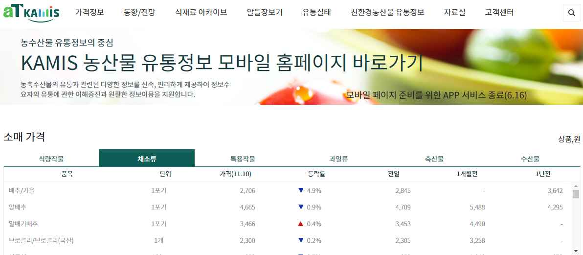 ☛ KAMIS 농수산물유통정보 누리집 https://kamis.or.kr