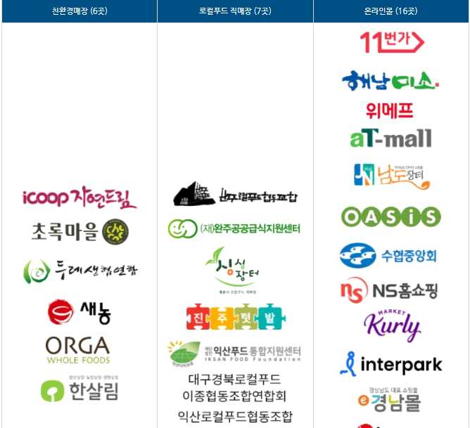 ▶ 오프라인 매장 : 대형 · 중소형 마트, 친환경 매장, 로컬푸드 직매장, 지역 하나로 마트