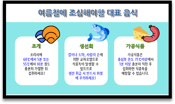- 위 세 가지만 잘 지켜도 여름에 식중독에 걸릴 확률을 대폭 낮출 수 있음