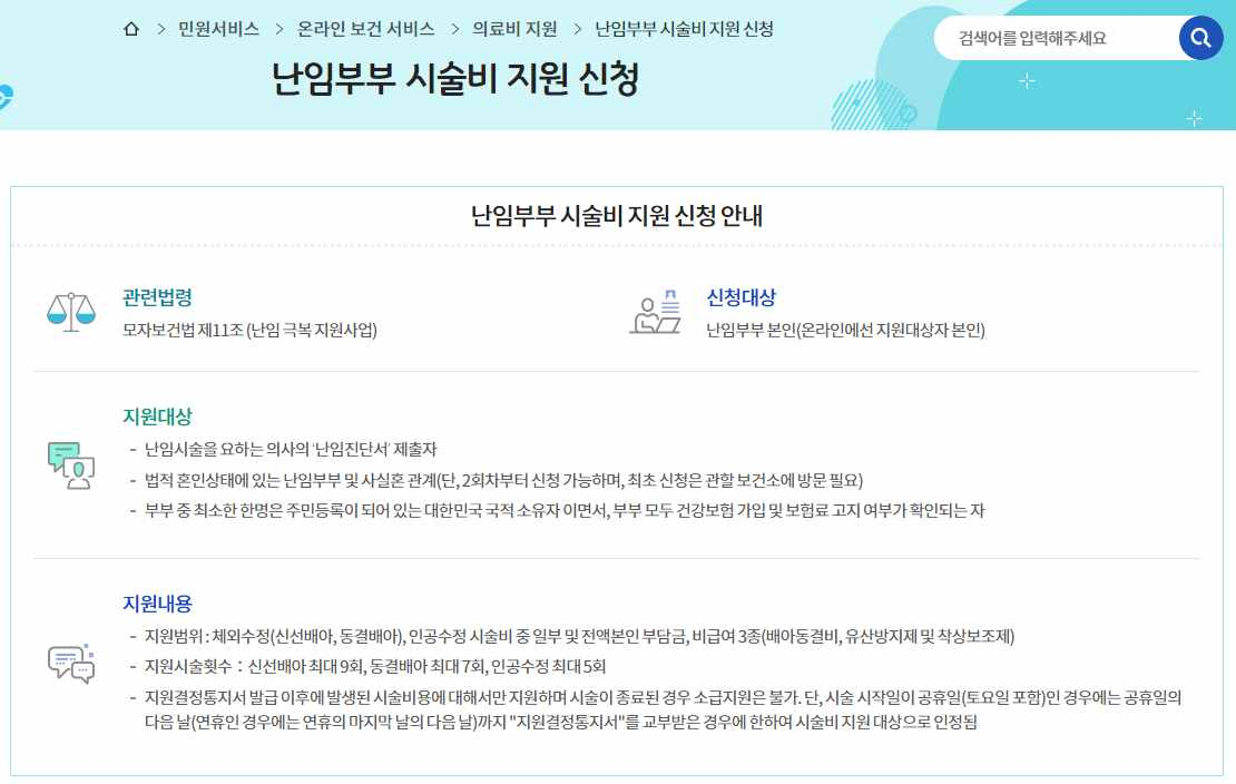 - 시술 간 횟수 제한이 폐지, 건강보험 급여 적용 횟수가 소진된 난임 시술을 포함하여 총 22회 횟수 내에서 시술비가 지원
