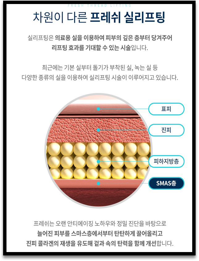 ➽ 실리프팅 : 처진 피부를 팽팽하게 하기 위하여, 피부에 가느다란 실을 넣어 당겨주는 성형술