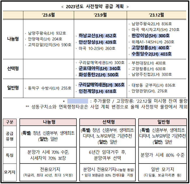 1) 정부가 2023년 공공분양주택 뉴홈의 사전청약 대상지와 시기 등을 확정하고 본격적인 공급에 나섬