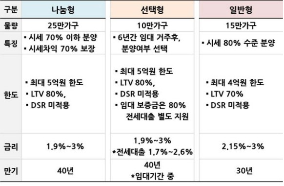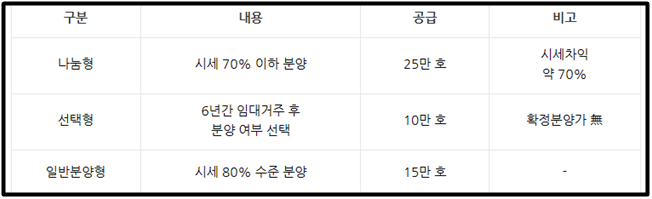 ▶ 정부는 향후 5년간 나눔형 25만 가구, 일반형 15만 가구, 선택형 10만 가구를 분양할 계획
