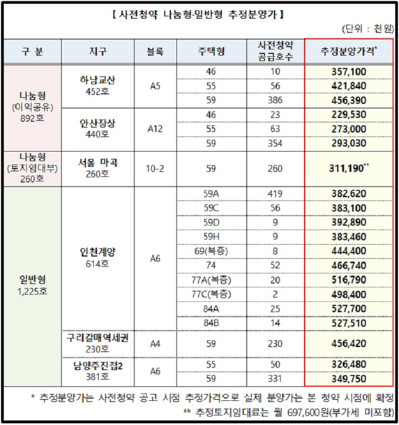 1) 나눔형과 일반형의 추정분양가