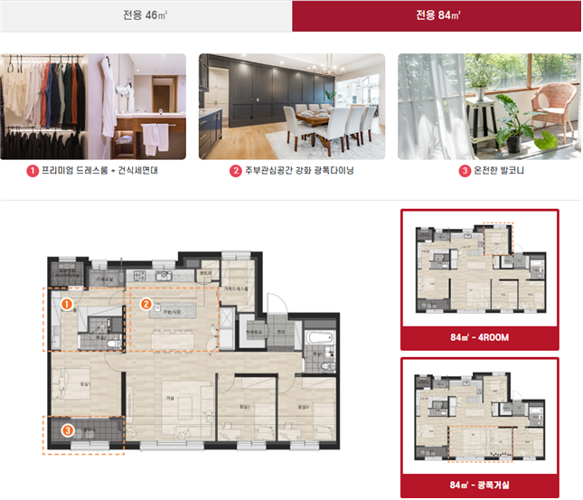 - 전용면적 기준 60㎡ 이하의 경우 2억~4억 원대, 69~84㎡의 경우 4억~5억 원대 수준으로 산출