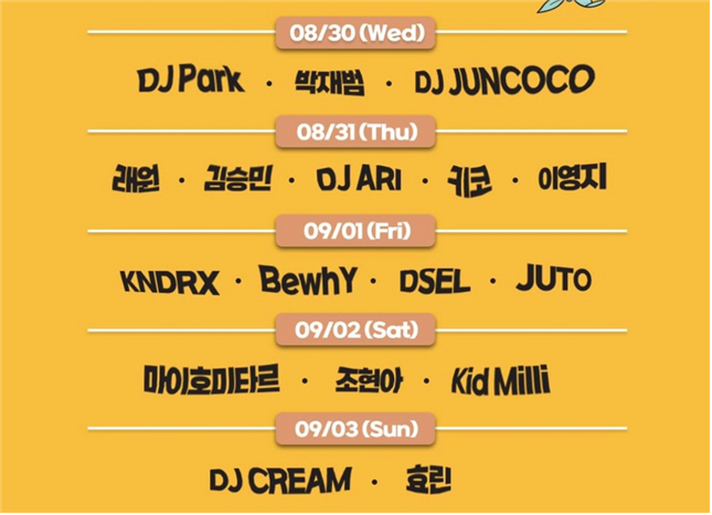 ▶ 8월 30일(수) : DJ park(박명수), 박재범, DJ Juncoco, 첫날부터 화려한 라인업
