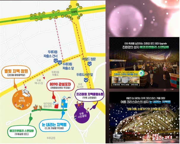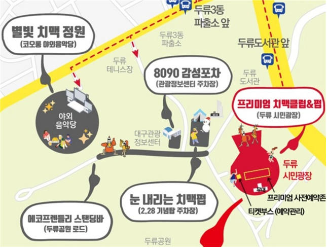 - 별빛 치맥 정원(야외음악당), 8090 감성 포차(관광정보센터 주차장), 프리미엄 치맥클럽펍(두류시민광장), 눈 내리는 치맥펍(2.28 기념탑 주차장), 에코프랜들리 스탠딩바(두류공원 로드)로 구역 설정