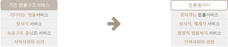 * 법률상담, 법 교육, 소송절차 안내, 법률구조법인 및 사회복지기관 연계 등의 1차 법률서비스 무료 제공