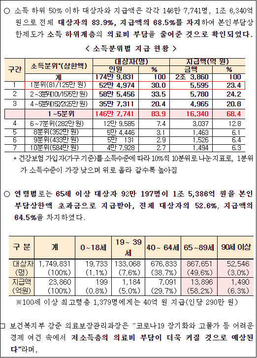 - 연령대별로는 65세 이상 대상자 92만 197명이 1조 5,386억 원을, 본인 부담 상한액 초과금으로 지급받아, 전체 대상자의 52.6%, 지급액의 64.5%을 차지