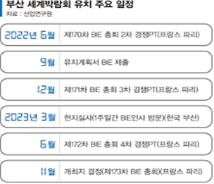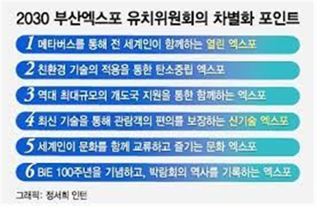 부산시는 2030 엑스포를 동구 지역 위치한 북항 재개발 2단계 지역에 엑스포를 유치 선정, 삼성전자, 현대차, SK, LG, 롯데, 포스코 등 대기업이 총력 가세, 61조 원 61조 원의 경제 효과와 정부와 좋은 관계형성으로 원활한 기업 운영 의도