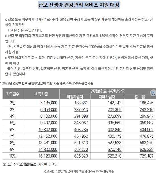 * 산모 · 배우자 등 해당 가구의 건강보험료 본인부담금 합산액이 기준중위소득 150% 이하인 출산가정