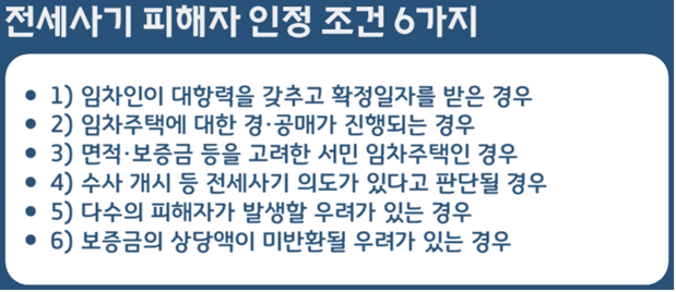 - 전세 사기 특별법은, 피해자의 신청을 접수한 임차인이, 관할 지자체의 조사 및 심의를 거치면, 경·공매 유예 및 정지, 우선 매수권, 대출 등 금융지원을 받을 수 있는 법