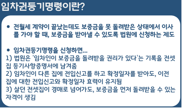 ※ '임차권등기명령'은 전월세 계약이 끝났는데도 보증금을 돌려받지 못했을 때, 돌려 받기 위해 법원에 신청하는 제도