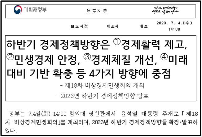 - 정부는 지난 7월 4일, '2023년 하반기 경제 정책 방향'을 발표한 바 있습니다. 정부의 하반기 경제 정책 방향이, 부동산 시장에서 제시된 '상반기 부동산 핫이슈 5'를 얼마나 반영하고 있는지 알아 보고자 합니다.