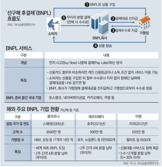 - 저신용자라도 물건을 선 구매하고 후 결제하는 후불결제 서비스 BNPL(Buy now play later)가, 세계 청년층을 중심으로 새로운 소비 트렌드로 자리 매김