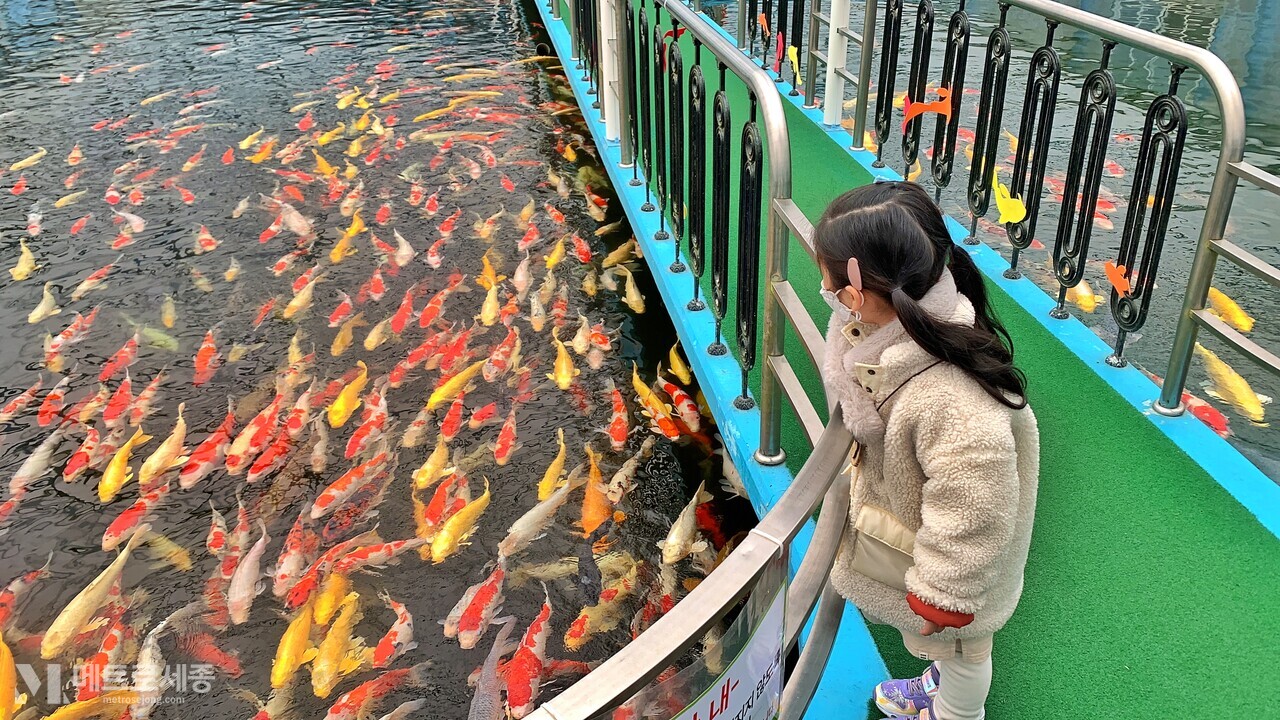 - 비단잉어를 더욱 가까이 보고 싶다면, 연못 초입에서 판매하는 사료를 조금씩 뿌려줌
