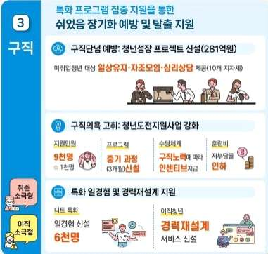 - 청년이 구직 활동을 단념하지 않도록 돕는 사업으로, 10개 지자체를 통해 2024년부터 시행될 예정
