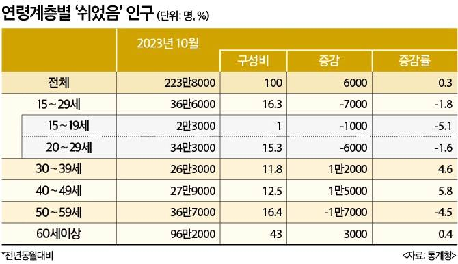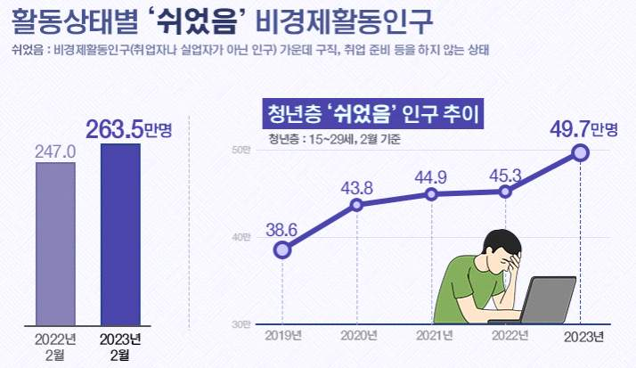 - '쉬었음' 기간 : 1년 미만이 절반 이상(56%), '장기 쉬었음' 비중은 증가 추세(2018년 36%에서 2023년 44%)