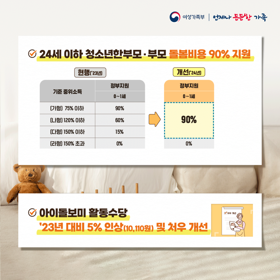 ▶ 24세 이하 청소년 한 부모 · 부모 돌봄 비용 90% 지원