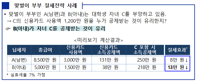 ☛ 따라서, 맞벌이 부부의 경우에는 부양가족 공제, 부양가족의 교육비 · 기부금 · 신용카드 등을 누가 공제받는 것이 더 유리한지 미리 확인 가능