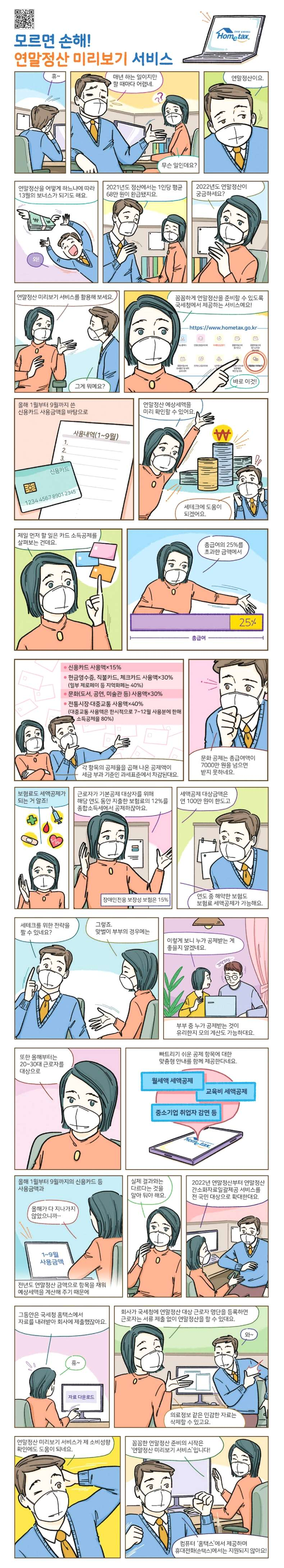 국세청은 10월 31일 2,000만 근로자의 편리한 연말정산을 위해, 더욱 개선된 '연말정산 미리 보기'와 '간소화 자료 일괄 제공' 서비스를 개통한다고 밝혔습니다.