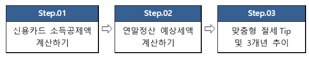 연말정산 미리 보기는, 올해 신용카드 사용 금액과 과거 공제금액을 기초로, 내년 연말정산 세액을 계산하고 절세 전략을 세울 수 있는 서비스입니다.