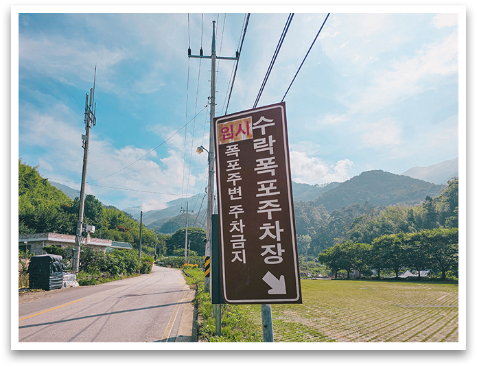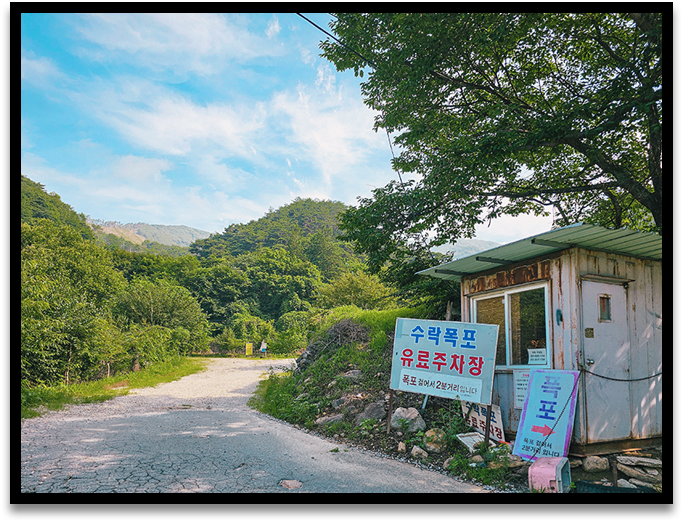 수락폭포 입구에는 무료 대형 주차장이 조성되어 있고, 수락폭포 상가에는 유료 주차장이 마련되어 있으니, 주차시설 이용하기에 크게 불편은 없지 않을까 합니다.