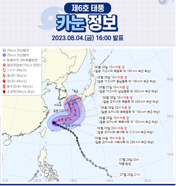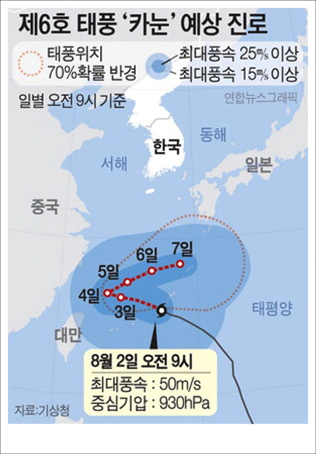 - 한국 기상청, 제6호 태풍 카눈의 예상 진로도를 보면 일본 기상청과 유사합니다.