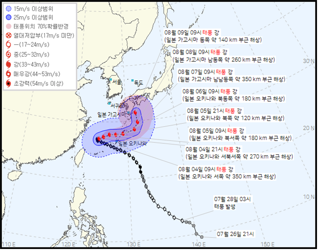 - 앞으로 태풍 진로도를 보면, 8월 6일 오전 9시 일본 오키나와제도를 통과해 8월 8일 오전 9시까지 동북동~동진하다가, 8월 8일 이후 북진으로 방향을 전향할 것으로 보입니다.