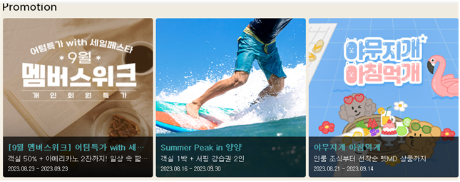 - 기준금액 이상 사용 가능 : 예시) 10만 원 객실 결제 시, 5만 원을 할인받을 수 있는 쿠폰팩을 받을 수 있음