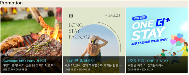 - 주중 1박 예약하면, 1박 무료 패키지와 반일 반값 패키지를 추천