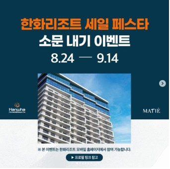 여행 가기 좋은 시즌이 돌아왔습니다. 이번 가을 여행을 준비하시는 분들은, 숙소 예약 전에 필수 체크 후 비교해서, 한화리조트 세일 페스타로 최대 할인받고 떠나보시는 게 어떠한지요.