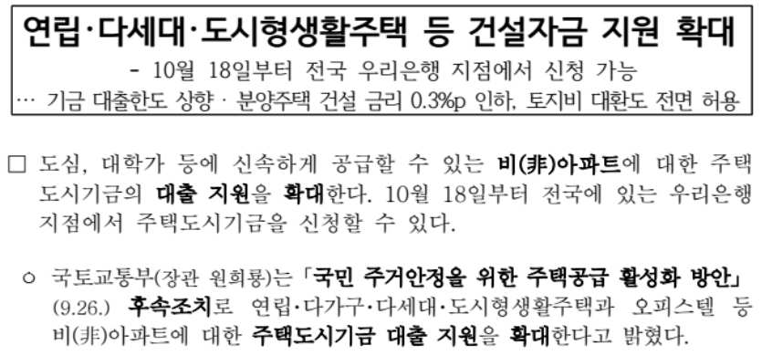 국토교통부는 국민 주거 안정을 위한 주택공급 활성화 방안(9.26) 후속 조치로, 연립주택, 다가구주택, 다세대, 도시형 생활주택, 오피스텔 등 도심, 대학가 등에 신속하게 공급할 수 있는 비아파트에 대한 주택도시기금 대출 지원을 확대한다고 밝혔습니다.
