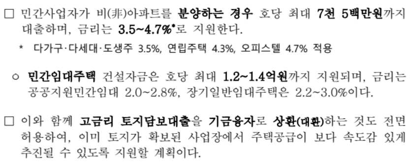 10월 18일부터 1년간 연립, 다가구, 다세대, 도시형 생활주택, 오피스텔 건설 시 대출 지원을 확대합니다. 고금리 토지담보대출을 기금융자로 상환(대환) 하는 것도 전면 허용하여, 이미 토지가 확보된 사업장에서 주택공급이 속도감 있게 추진될 수 있도록 지원할 계획입니다.