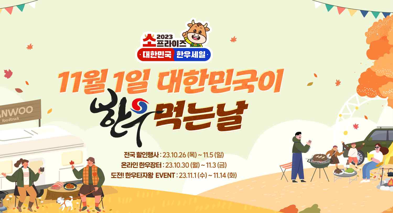 '소프라이즈 2023 대한민국 한우 세일'의 일환인 이번 행사는, 11월 1일 '대한민국이 한우 먹는 날'을 맞아 전국적으로 한우 소비 붐을 조성하고 있습니다.