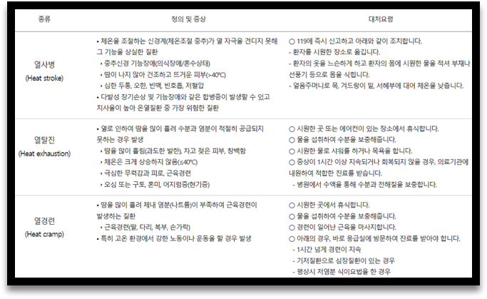 - 온열질환은 고온다습한 날씨에 장시간 노출 시 빈번하게 발생