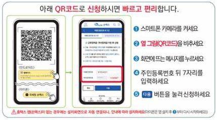① 서면 안내문의 QR코드 스캔 ② '홈택스 모바일앱 신청화면' 연결 ③ 주민등록번호 뒤 7자리 입력 → 신청 완료