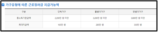 ◆ 가구 유형에 따른 근로장려금 지급가능액(표 참조)